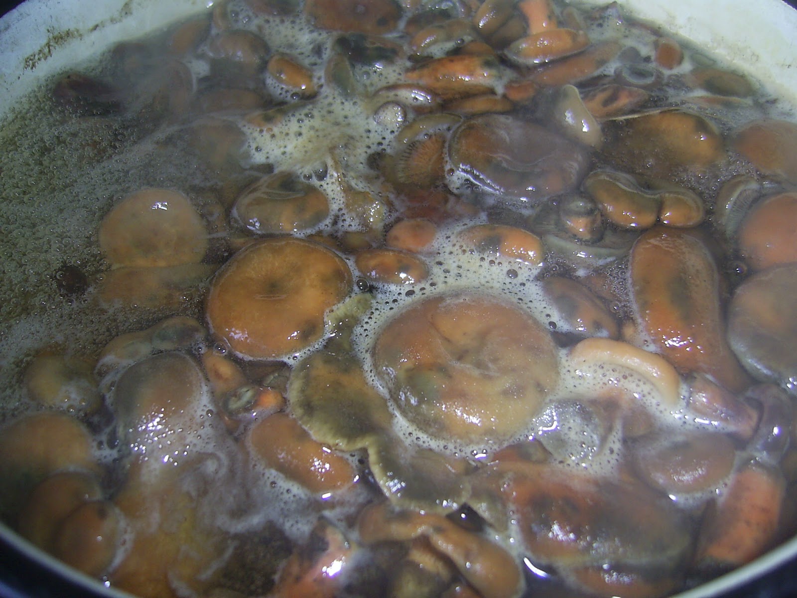 - В отдельную емкость с водой всыпать все специи, пряности, соль и на среднем огне довести до кипения. Когда поверхность начнет активно пузыриться, всыпать грибы и готовить еще 15 минут.