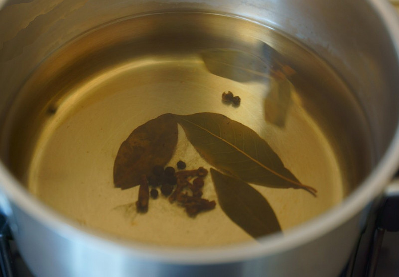 - Фильтрованную воду подогреть, влить уксус, забросить соль и специи и прокипятить маринад в течение 5 минут.